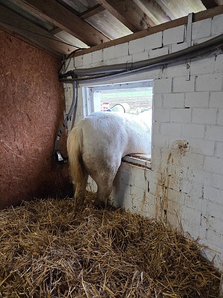 Das Pferd musste den Angaben nach mit schwerem Gerät gesichert, narkotisiert und angehoben werden. Es sei gelungen, den Schimmel vorsichtig aus dem Fenster zu heben, ohne die Wand aufstemmen zu müssen.
