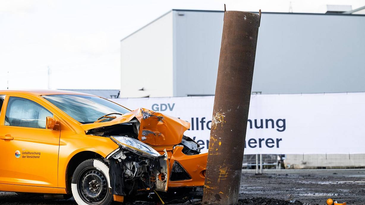 Der orangefarbene Wagen ist nach dem Versuchscrash tief eingedrückt. Der Fahrer wäre tot oder mindestens schwer verletzt, sagt die Leiterin der Unfallforschung der Versicherer (UDV), Kirstin Zeidler. «Ein heftiger Aufprall, der in der Praxis oft tödlich endet», sagt sie.