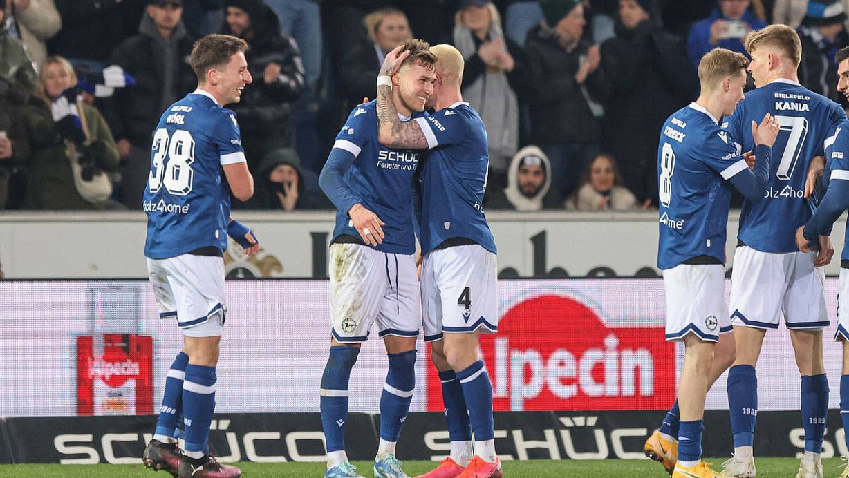 Joel Grodowski (2. v.l) schoss Arminia Bielefeld mit zwei Toren zum Sieg gegen Stuttgart II. | © Oliver Krato