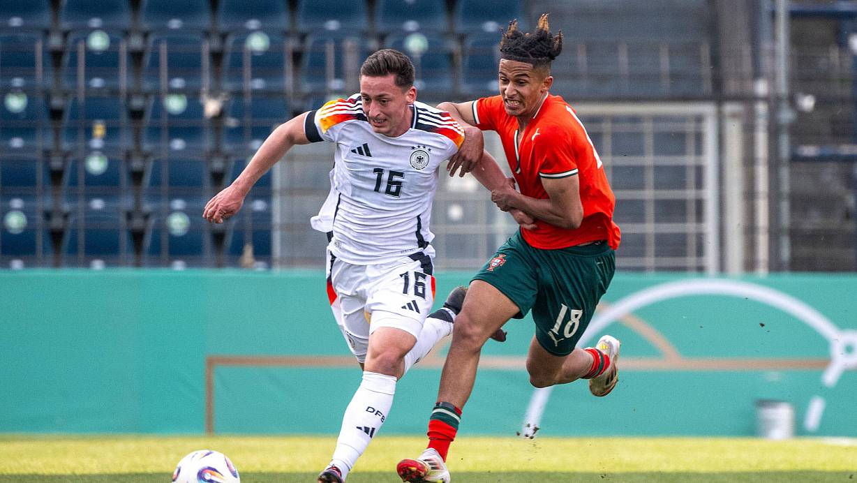 Auch schwarz-rot-gold steht ihm gut: Marius Wörl (l.) im Duell mit dem Portugiesen Leandro Martins beim U20-Eliteleague Spiel in Babelsberg. | © IMAGO/Matthias Koch