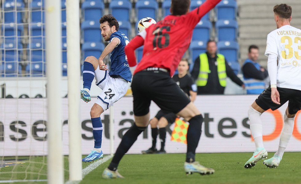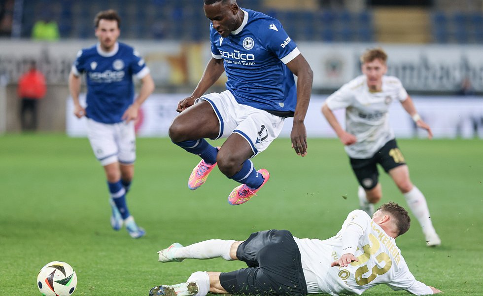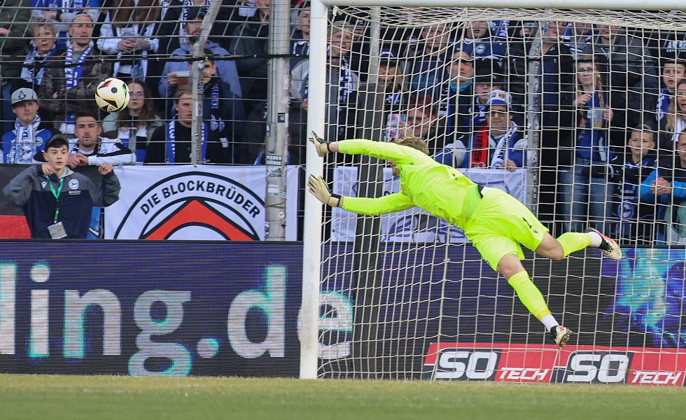 Mit Wiederanpfiff arbeitete Arminia umgehend daran, Profit aus der numerischen Überlegenheit zu schlagen. Dass es dabei galt, nicht den Kopf zu verlieren, merkte der Tabellendritte in der 52. Minute. Einen gefährlichen Konter der Gäste schloss Agrafiotis mit seinem Flachschuss ab. Kersken tauchte ab und parierte. Im direkten Gegenzug blockte Torhüter Stritzel eine Flanke vor die Füße von Sarenren Bazee, der den Ball aber nicht im Tor unterbrachte.