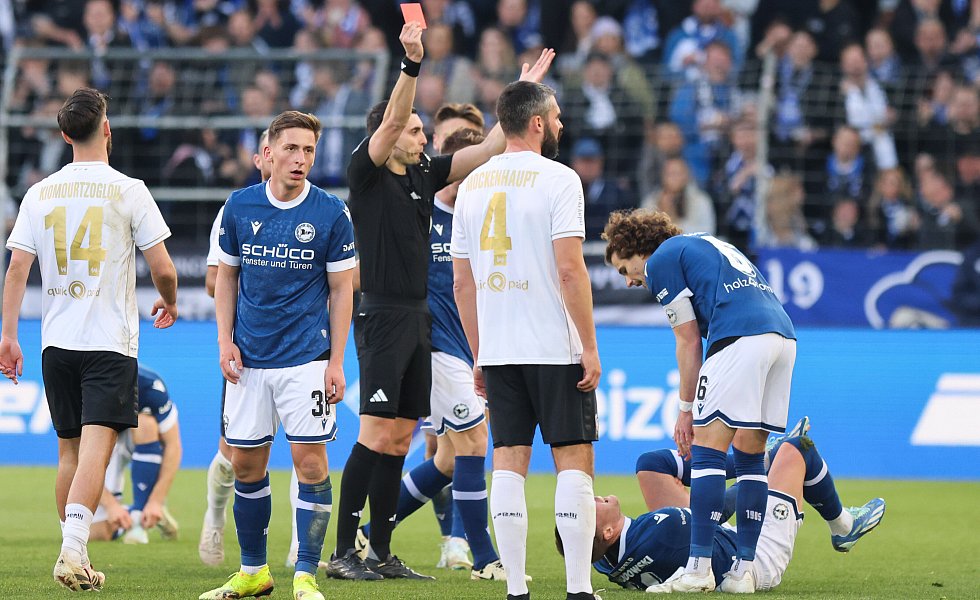 Die Bielefelder waren nun darum bemüht, noch vor der Halbzeit den Abstand von zwei Toren wiederherzustellen. Sarenren Bazee scheiterte mit seinem Kopfball aus kurzer Distanz am glänzend reagierenden Florian Stritzel (43.). Es sollte noch nicht der letzte Aufreger der ersten Hälfte gewesen sein. Gözüsirin beendete eine Bielefelder Umschaltsituation mit einem Tritt von hinten auf die Achillessehne von Joel Grodowski (45.+2). Schiedsrichter Timon Schulz zögerte nur kurz und zückte Rot. Der Schlusspunkt einer turbulenten Halbzeit.