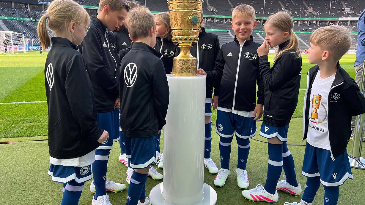 Angereist sind die Kinder zusammen mit Eltern oder Großeltern bereits am Freitag. Am Samstagnachmittag durften sie vor dem Spiel im Stadion den Pokal bestaunen. Dann haben sie Fußballprominenz getroffen: Per Mertesacker und Christoph Kramer – die beiden ZDF-Experten – und Arminia-Legende Fabian Klos.