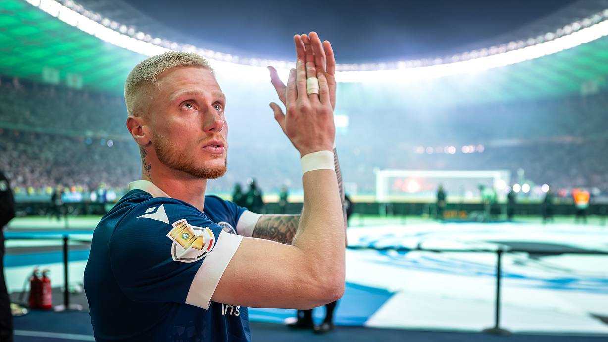 Nach der Niederlage im DFB-Pokalfinale am 24. Mai gegen den VfB Stuttgart applaudiert Louis Oppie den Arminia-Anhängern. | © Teresa Kroeger/RHR-FOTO