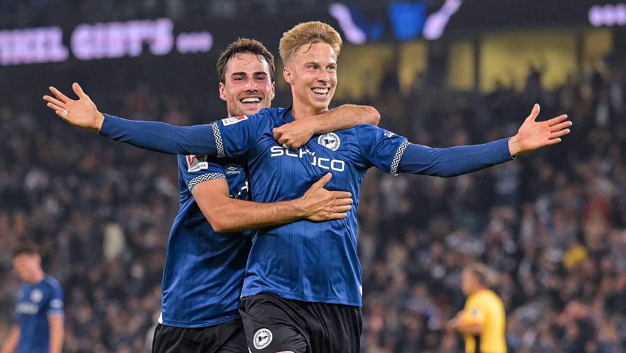 Das Tor und den Jubel von Sam Schreck, der für Arminia gegen Düsseldorf spät zum 5:1-Endstand traf, hat Kiels Trainer Marcel Rapp vor dem Fernseher schon gar nicht mehr gesehen. | © Teresa Kroeger