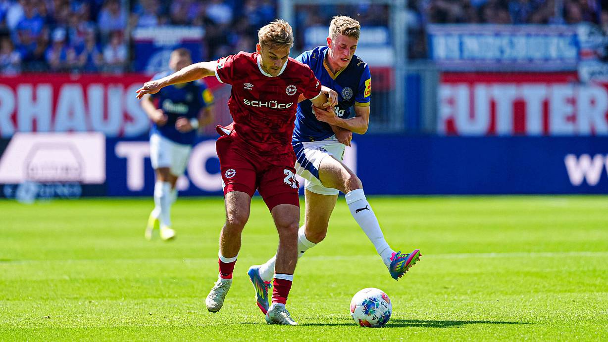 Arminias Tim Handwerker (l.) hatte auf seiner linken Seite alles im Griff. Hier läuft er den Kieler Alexander Bernhardsson ab. | © IMAGO/Eibner