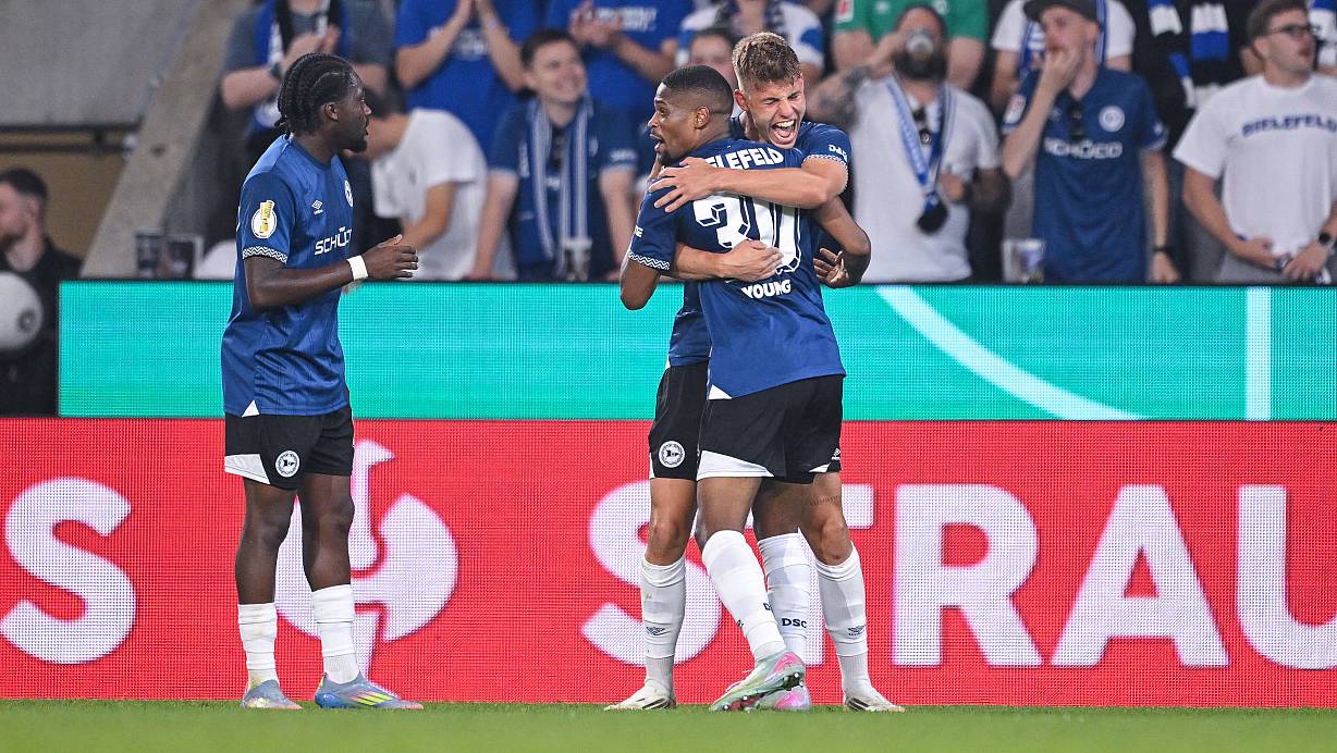 Isaiah Young (Nummer 30) bejubelt Arminias 1:0-Siegtreffer gegen Werder Bremen mit Julian Kania und Benjamin Boakye (l.). Das Trio war im Laufe der Partie eingewechselt worden. | © Teresa Kroeger