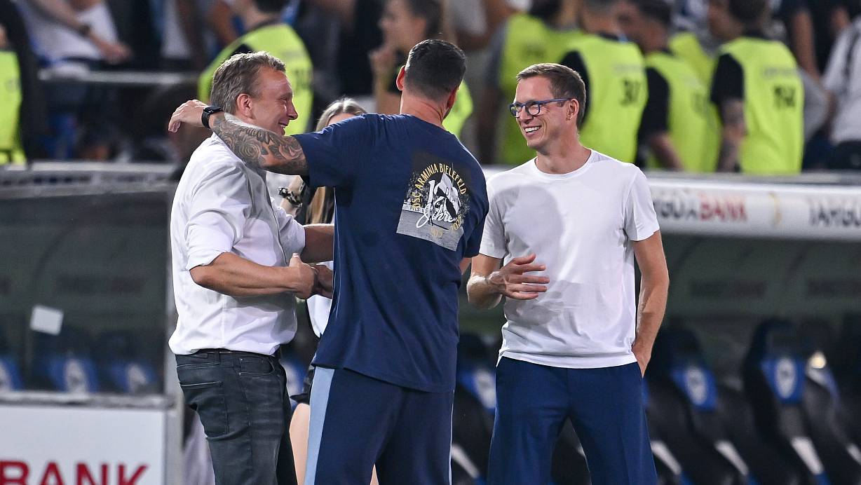 Drei wesentliche Säulen für Arminias Erfolg: der kaufmännische Geschäftsführer Christoph Wortmann, Trainer Mitch Kniat und Sport-Geschäftsführer Michael Mutzel (v.l.) freuen sich über den Erstrundentriumph im DFB-Pokal gegen Werder Bremen. | © Teresa Kroeger