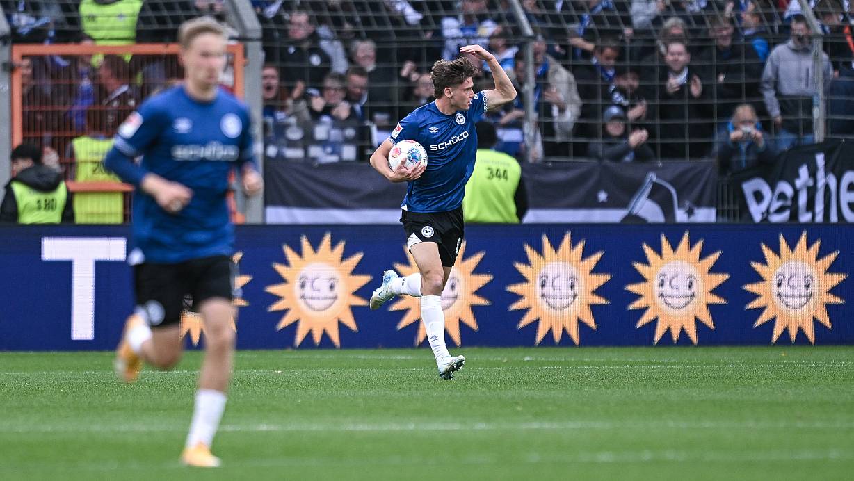 Maximilian Großer (r.) hat für Arminia gegen Schalke auf 1:2 verkürzt. Mit seiner Geste fordert er das Publikum auf, die Mannschaft bei ihrem Versuch, noch den Ausgleich zu erzielen, lautstark zu unterstützen. Doch am Ende verlässt Bielefeld erneut als Verlierer das Feld. | © KROEGER/RHR-FOTO