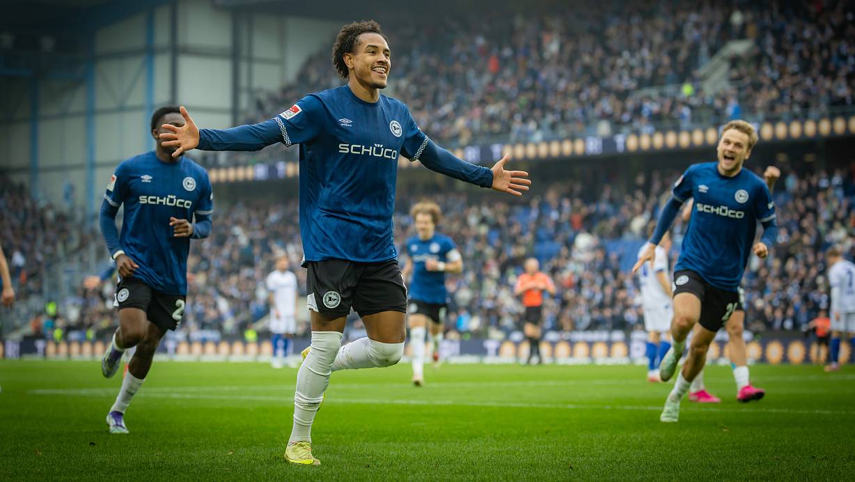 Arminias Doppeltorschütze Monju Thaddäus Momuluh lässt sich feiern. | © Sarah Jonek