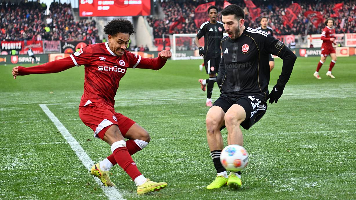 Für Monju Thaddäus Momuluh (l.) und die Offensive von Arminia Bielefeld war in Nürnberg kein Durchkommen. | © IMAGO/Zink