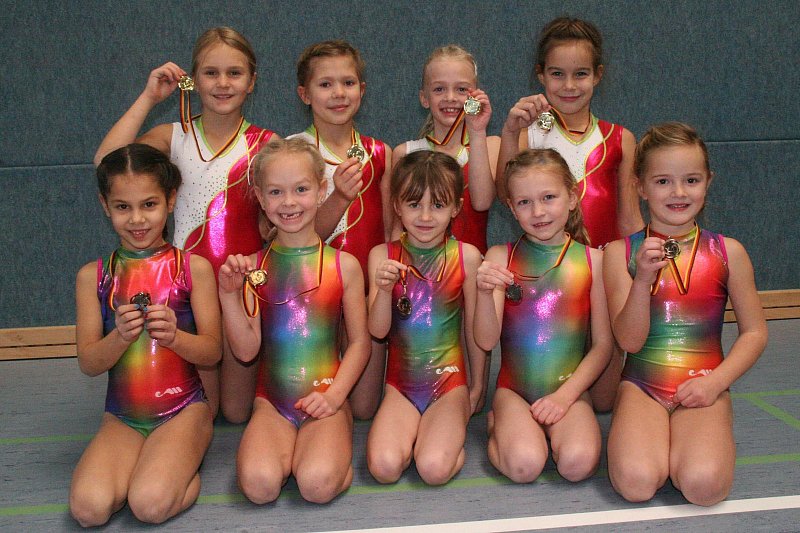 Eine Medaille zu gewinnen, war auch der große Traum der kleinsten Steinhagener Turnflöhe. Ihrem Alter entsprechen würden sie eigentlich erst im nächsten Jahr mit den ersten Wettkämpfen beginnen. „Es ist schon lobenswert allein, dass sich Emilia Hübner, Lina Spille, Maja Korzenietz, Ronja Brinkmann, Bennu Cumut und Lorena Vijande Giamblanco überhaupt an den Start gegen die bis zu drei Jahre ältere Konkurrenz traute", sagte Kirsi Rohmeier. Umso schöner, dass der Traum der von Lara-Marie Schimmel und Jessica Langel betreuten Turnerinnen in Erfüllung ging: Die Leistungssteigerungen von Wettkampf zu Wettkampf wurden belohnt und am Ende strahlten die Turnerinnen mit der Bronzemedaille um den Hals um die Wette.