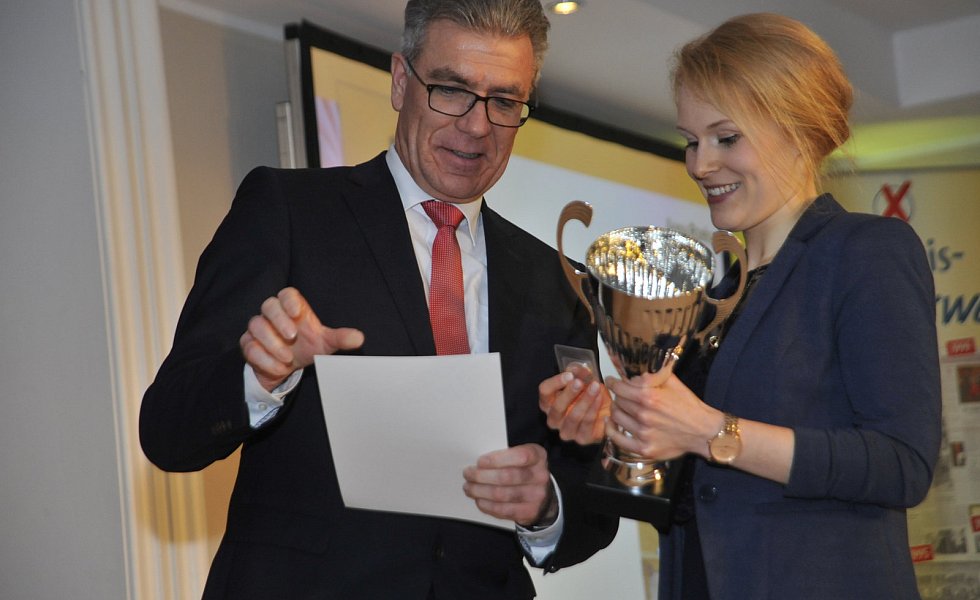 Am Ende war es Karolin Kuhlmann, die dank einer knappen Mehrheit bei den Stimmen der HK-Leserinnen und -Leser im vereinsinternen Rennen die Nase vorn hatte. „Ich bin jetzt zum sechsten Mal dabei. Zum ersten Mal oben zu stehen, ist ein schönes Gefühl", sagte die 22-Jährige. Verdient hat es Kuhlmann allemal: 2017 etablierte sie sich in der nationalen Spitze der Sprinterinnen. Drei Mal schaffte die sympathische Künsebeckerin bei deutschen Meisterschaften den Sprung in das A-Finale über 50 Meter. Den Pokal erhielt die seit September in Versmold tätige Polizistin aus den Händen ihres Chefs, Landrat Sven-Georg Adenauer.