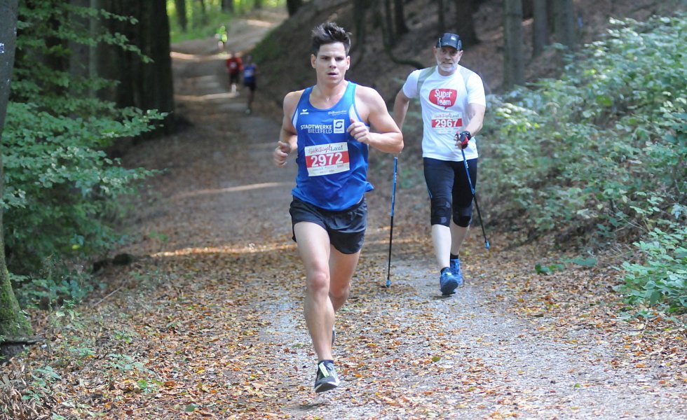 Hermannslauf-Legende Elias Sansar, zuletzt 2016 in Werther erfolgreich, setzte sich bei den Männern erneut durch. Aber der 38-Jährige hielt den Ausgang des Männerrennens lange offen, überließ im Teuto Titelverteidiger Hendrik Pohle und Marius Güths, Sieger von 2015, die Initiative. „Viele Steine und Baumwurzeln waren gefährlich", sagte Sansar. „Vor dem Essen-Marathon hatte die Gesundheit Vorrang."