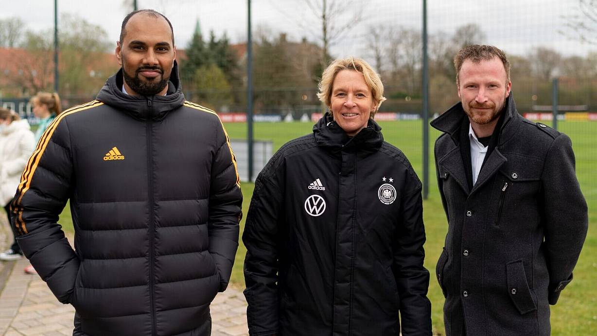 Chris Punnakkattu Daniel (l.) und Tobias Neumann bei einem Treffen mit Bundestrainerin Martina Voss-Tecklenburg in der Klosterpforte. Foto: Alexander Ness | © Alexander Ness