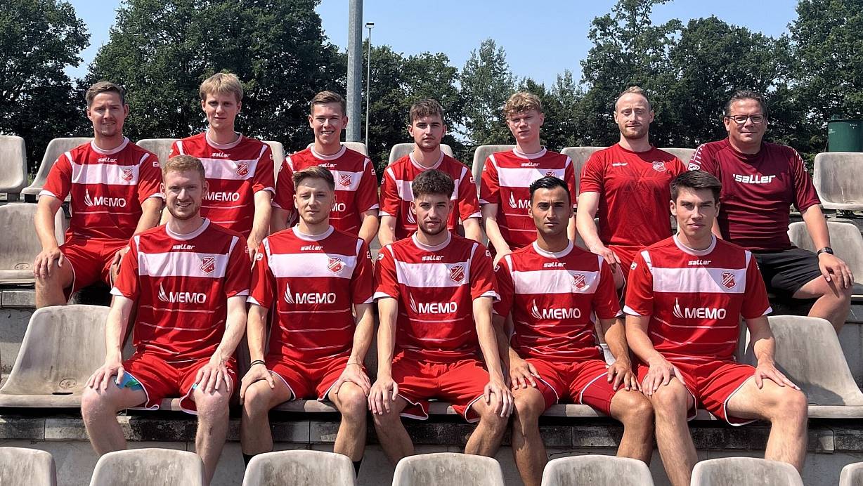 Tobias Kreutzer (h.v.l.), Louis Dingerdissen, Luca Wiggelinghoff, Ben Siepmann, Finn Faßbender, Florian Ernst und Trainer Andreas Brandwein sowie Pascal Claren (v.v.l.), Alessio Koring, Cedric Bergmann, David Cinar und Fynn Grahl wollen beim Neuaufbau in Steinhagen mithelfen. | © Fabian Neto Romeira