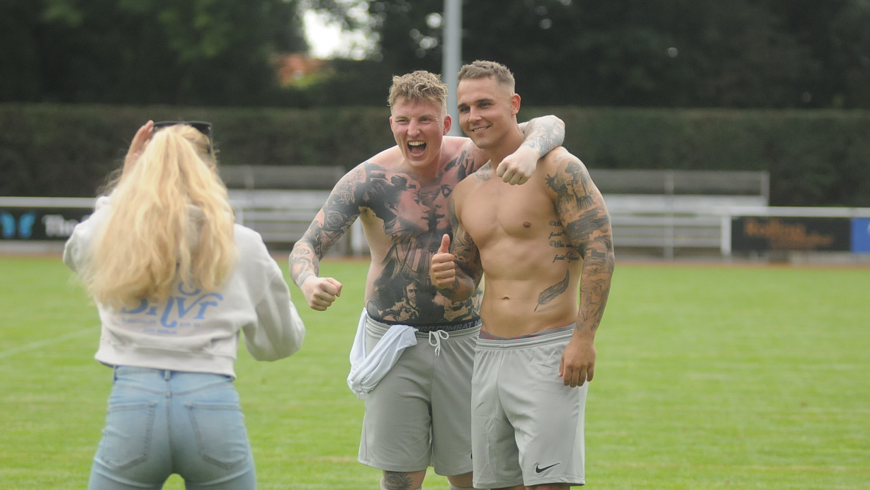 Jonny Jaspers (l.) und Tobias Pietrek, bekannt aus dem TV-Format "Ex on the beach" posierten gerne für ihre Fans auf dem Rasen. | © Dennis Bleck