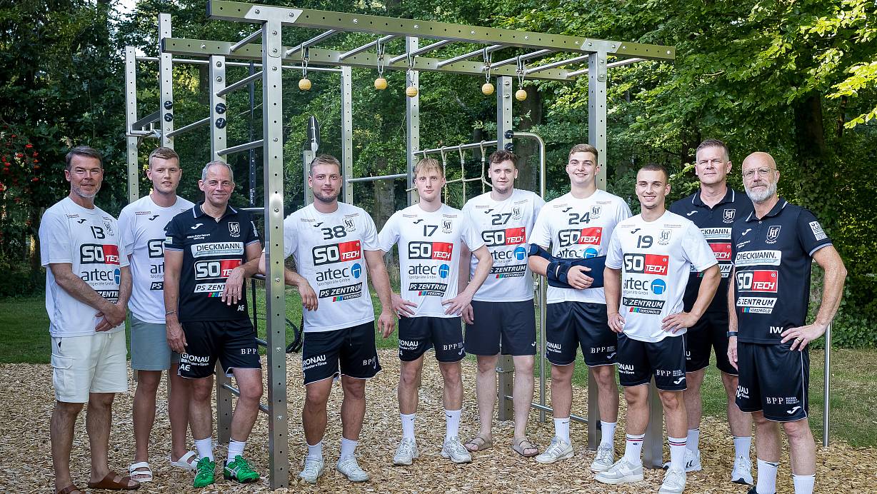 Daniel Berger (v.l.), Louis Pollmann (Gesundheitsforum Berger-Pollmann), Andy Evers (Sportliche Leitung), Jan Hübner, Alexander Greitens, Jannis Louis, Caspar Brockmeyer, Daniel Schidetzky, Thomas Lay (Trainer) und Ingo Walwei (Sportliche Leitung) hoffen auf eine erfolgreiche Regionalliga-Saison.?Foto: Sören Voss | © Sören Voss