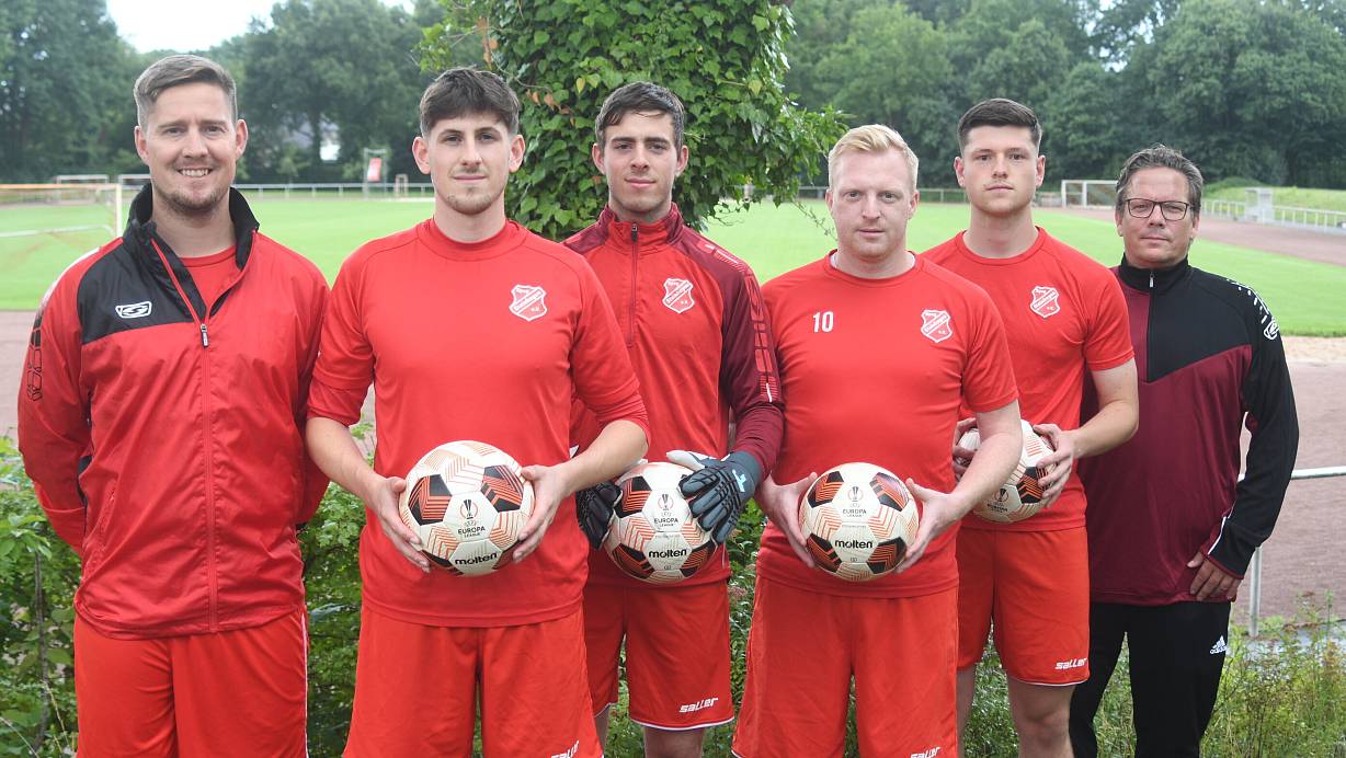 Steinhagens Co-Tobias Kreutzer (l.) und Chefcoach Andreas Brandwein (r.) begrüßen die Neuzugänge Noah Engelmann (v. l.), Tobias Winter, Michael Zech und Mattis Brüntrup. | © Christian Helmig