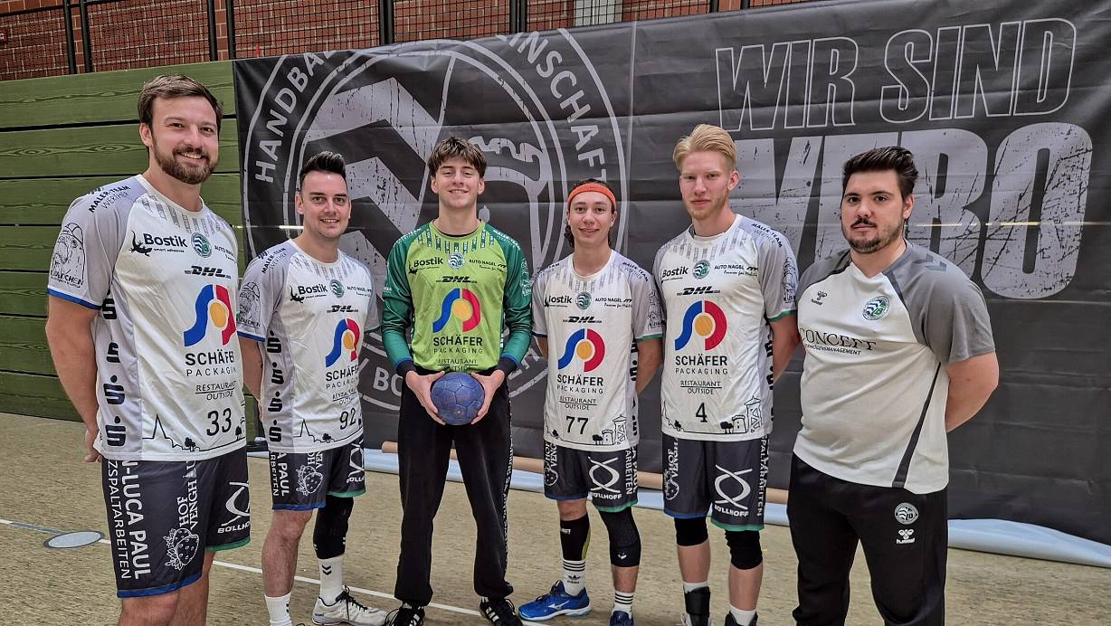 Trainer Albert Kreismann (rechts) kann bei der HSG mit fünf externen Neuzugängen arbeiten: Jendrik Lakebrink (von links), Julian Schüpping, Daniel Frey, Max Kleinepähler und Louis Hartmann. | © Gunnar Feicht
