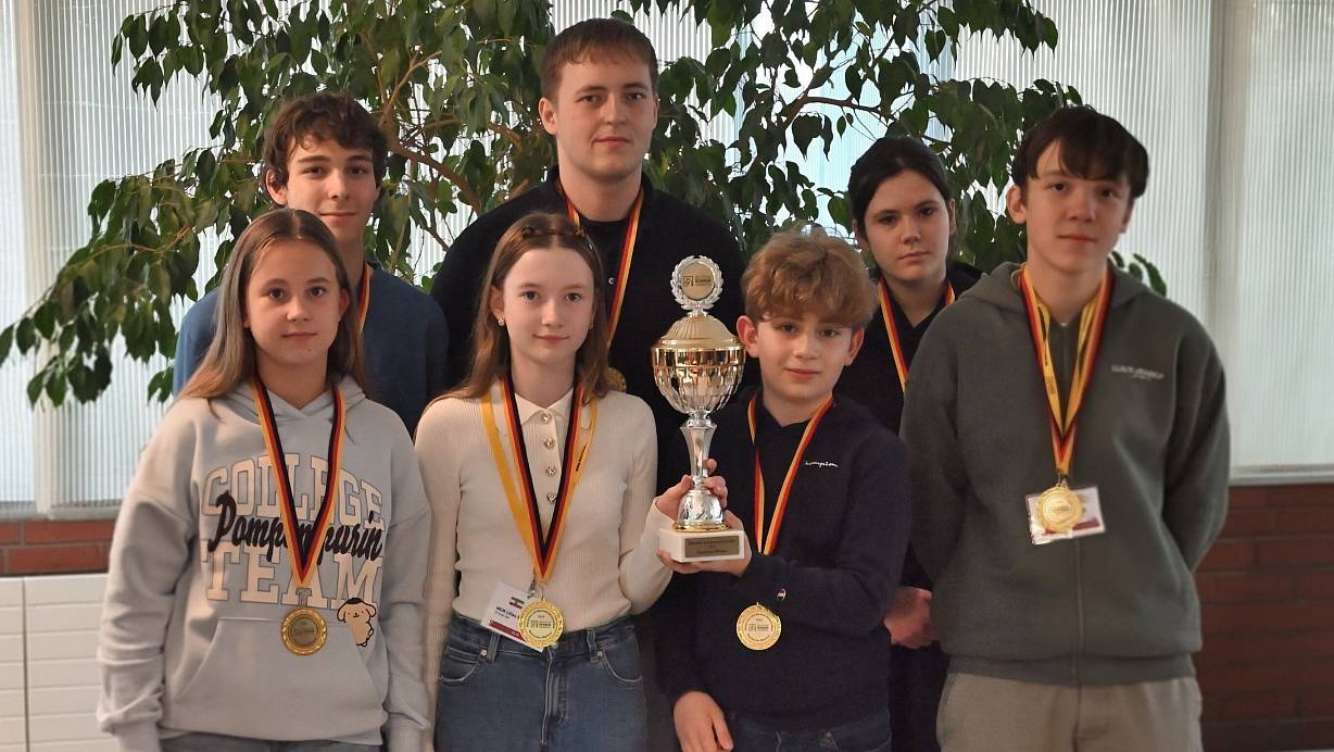 Lily Schirmbeck (v., 2., v. l.) zählt zu den größten deutschen Schach-Hoffnungen. Mit der NRW-Auswahl gewann sie jetzt die Deutsche Ländermeisterschaft. | © Markus Schirmbeck