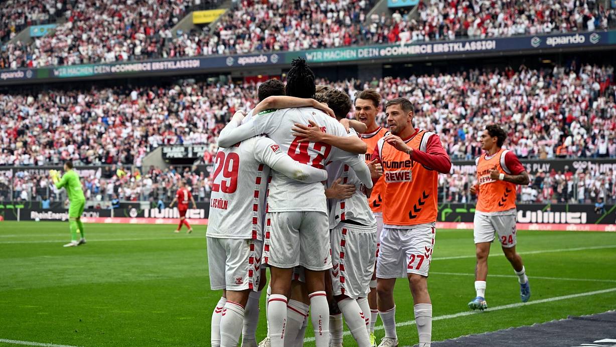 Denn Funkels Team machte bei ausgelassener Stimmung früh ernst. Eric Martel (14. Minute) und Luca Waldschmidt (29.) sorgten innerhalb der ersten halben Stunde für die Vorentscheidung und befeuerten in Köln-Müngersdorf die Euphorie. Florian Kainz (76.) und Mark Uth (87.) trafen auch noch. Weil der HSV mit 2:3 (0:1) bei Greuther Fürth verlor, zog der Effzeh sogar noch am einstigen Bundesliga-Dino vorbei.