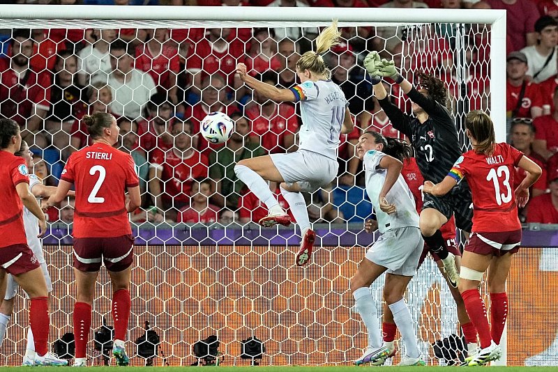 Eine farbenfrohe Eröffnungsshow samt Choreo hatte den Gastgeberinnen um die rechtzeitig fit gewordene Kapitänin Lia Wälti vom FC Arsenal zunächst zusätzlichen Schub. Vor allem die starken Außenbahnspielerinnen Riesen und Iman Beney interpretierten ihre Rolle offensiv. Die Führung war daher verdient, zumal die ebenfalls in Frankfurt unter Vertrag stehende Géraldine Reuteler kurz zuvor aus 18 Metern den Ball an die Latte gedroschen hatte.