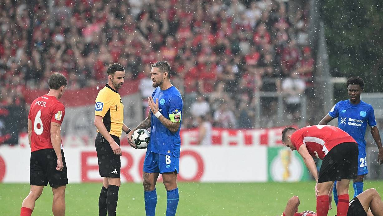 Beim Bayer-Auftritt schickte Schiedsrichter Michael Bacher beide Teams nach nicht einmal 20 Minuten wegen des Gewitters in die Kabine. Nach der Unterbrechung köpfte Torjäger Patrik Schick zur Führung ein (32.). Obwohl Großaspachs Kapitän Volkan Celiktas Gelb-Rot sah (66.), bekleckerte sich Leverkusen nicht mit Ruhm.