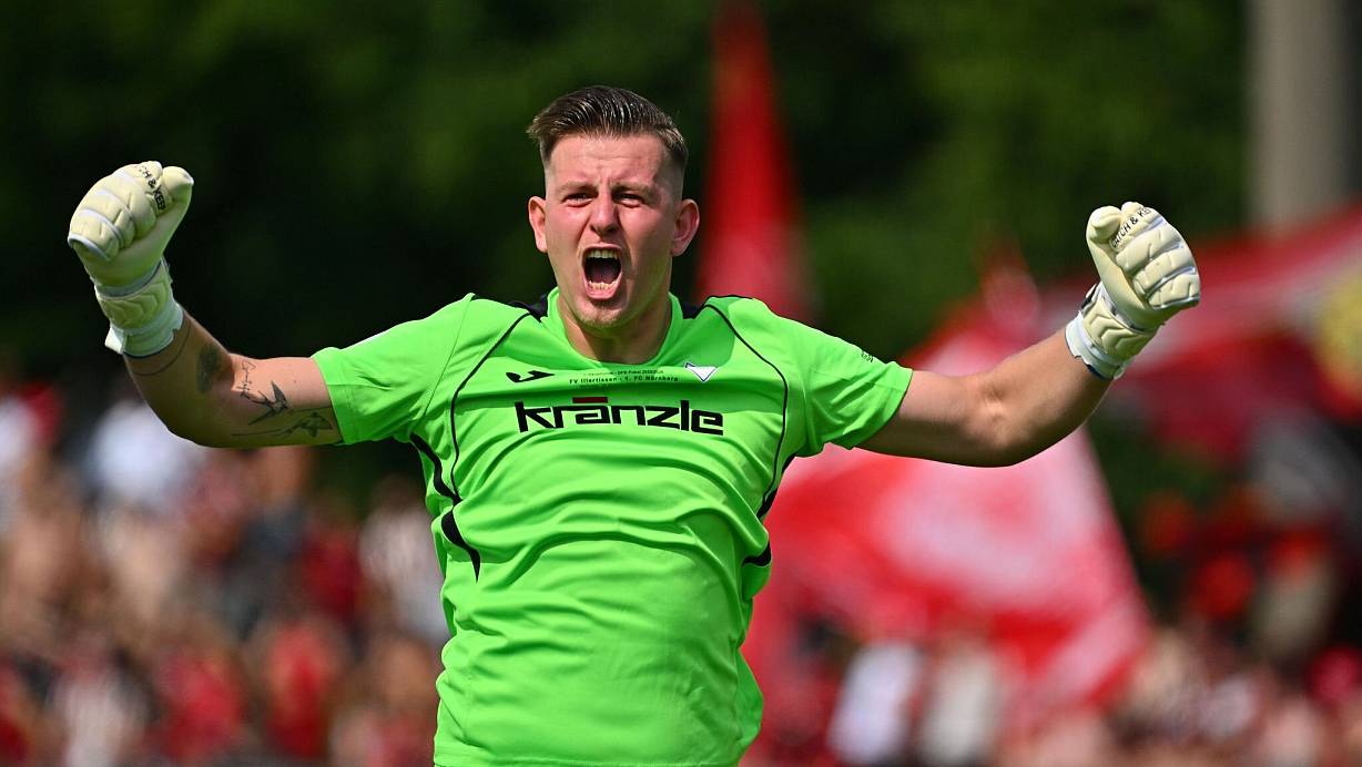 Der Mann des Tages: Illertissens Torwart Michel Witte hält zwei Elfmeter. | © Jan-Philipp Strobel/dpa