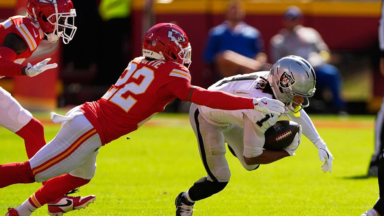 Die Defensive der Kansas City Chiefs (li. Trent McDuffie) ließ keinen einzigen Punkt der Las Vegas Raiders zu. | © Charlie Riedel/AP/dpa
