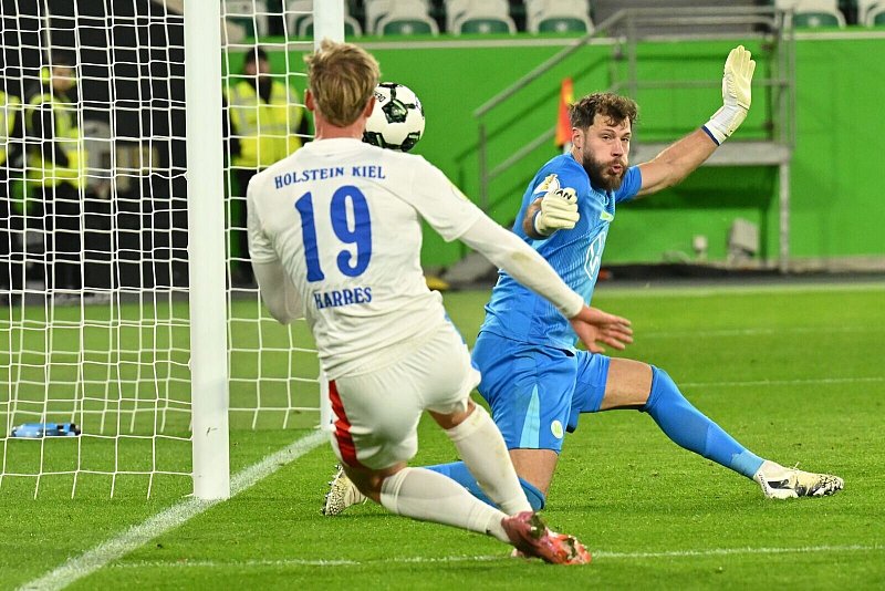 Wolfsburgs Torwart Marius Müller im Pokalspiel gegen Holstein Kiel. - © Swen Pförtner/dpa