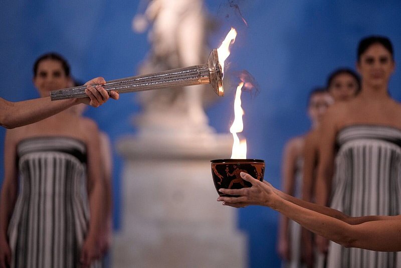 Anschließend zeigten Videoaufnahmen von vor zwei Tagen die Hohepriesterin der Zeremonie, die griechische Schauspielerin Mary Mina auf dem Gelände der antiken Stätte. Sie sprach die traditionellen Worte der Bitte an den Sonnengott Apollon, bevor sie die Fackel entzündete. Beim Festakt im Museum wurde das Feuer dann an den ersten Läufer des Fackellaufs, den griechischen Ruderer Petros Gaidatzis, übergeben.
