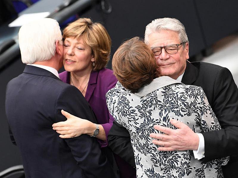 Macht's gut! Der neue Bundespräsident Frank-Walter Steinmeier und seine Frau Elke Büdenbender umarmen den ehemaligen Bundespräsident Joachim Gauck und seine Lebensgefährtin Daniela Schadt. Foto: Bernd von Jutrczenka