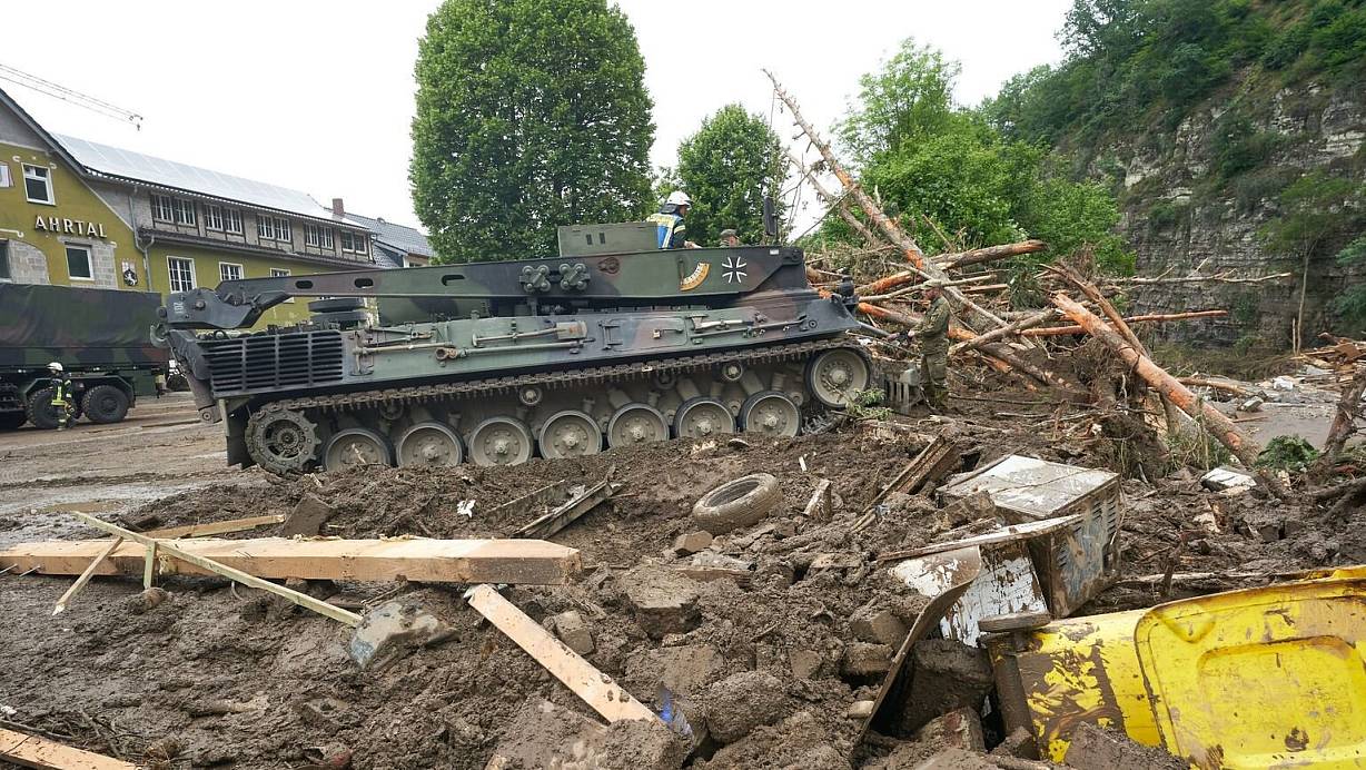 Neben der Unterstützung von Einsatzkräften aus anderen Bundesländern helfen derzeit auch rund 900 Soldatinnen und Soldaten bei der Bewältigung der Katastrophe. Die Rettung von Menschenleben stehe dabei im Vordergrund, die Bundeswehr unterstütze aber auch mit Material, teilte die Streitkräftebasis in Bonn mit. Das Verteidigungsministerium hatte wegen der Notlage einen militärischen Katastrophenalarm ausgelöst. Damit könnten Entscheidungen von den Verantwortlichen am Ort schneller getroffen werden, so ein Sprecher.