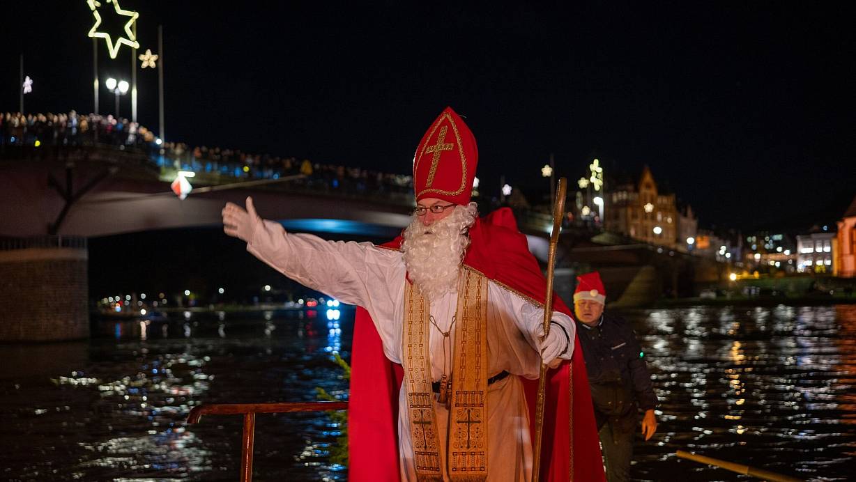 Von Fackelschwimmern begleitet ist der Nikolaus in Bernkastel-Kues in einem Ruderboot über die Mosel ans Ufer gekommen, um Kinder zu beschenken. An Land gelandet verteilte der Mann im roten Gewand mit weißem Rauschebart Schoko-Nikoläuse an kleine und große Kinder mit staunenden Augen.