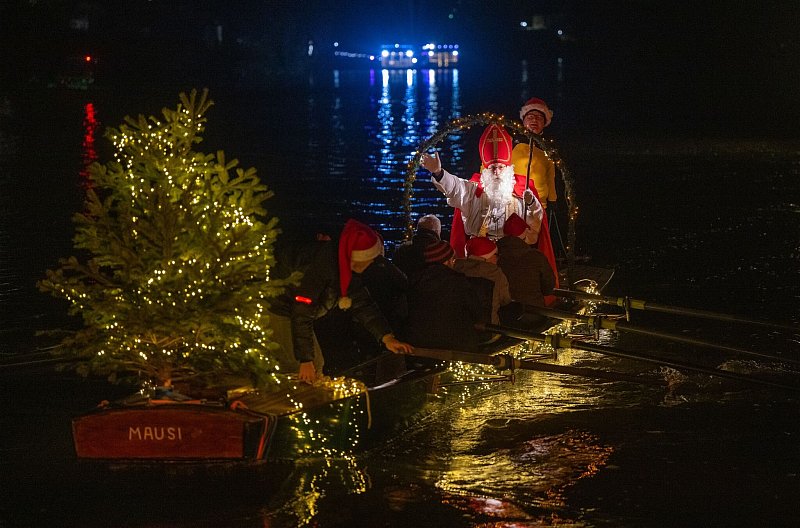Rund 100 Fackelschwimmer haben den Nikolaus im Ruderboot begleitet. - © Harald Tittel/dpa