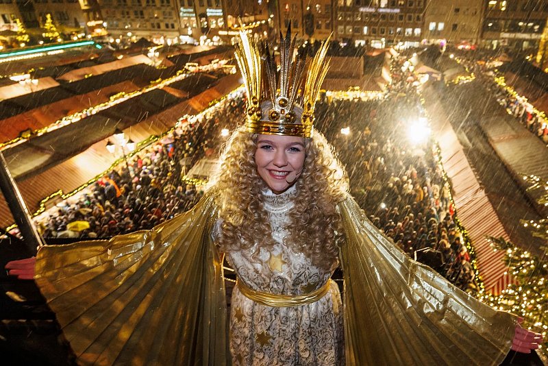 Ein mit Sternen verziertes Kleid, Lockenperücke, goldene Krone und Flügel - in diesem Gewand eröffnet das Christkind jedes Jahr den weltberühmten Nürnberger Christkindlesmarkt - von der Empore der Frauenkirche hoch über den Köpfen Tausender Menschen.
