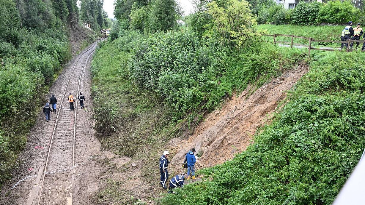 Am Hang klafft ein großes braunes Loch im sonst üppigen Grün: Hier hat wohl starker Regen die Erdmassen in Bewegung gesetzt - bis sie auf die Gleise rutschten. Ein paar Meter weiter liegen die Waggons des Unglückszuges, ineinandergeschoben und kreuz und quer über den Gleisen. «Wie eine Ziehharmonika», beschreibt eine Feuerwehrfrau den Anblick.