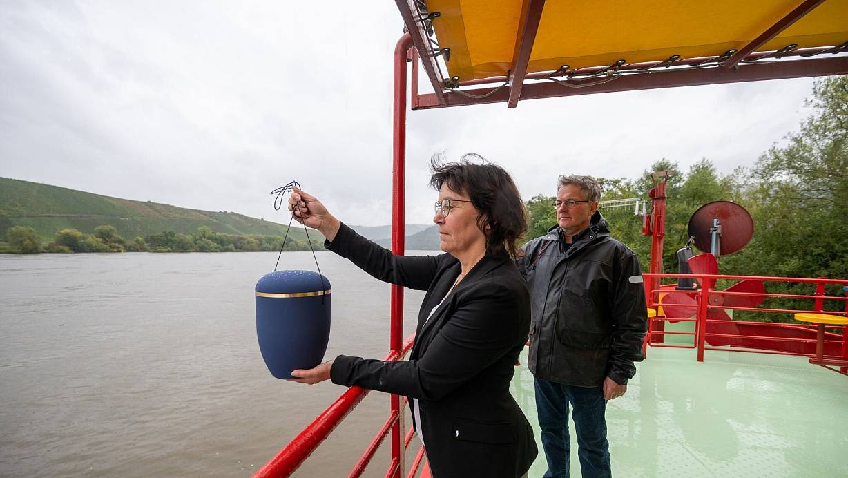 Auf dem Oberdeck eines Schiffes auf der Mosel steht eine Urne auf einem mit Blumen dekorierten Tisch. Bestatterin Ulrike Grandjean nimmt sie in beide Hände und trägt sie auf das Außendeck. Sie hebt das Gefäß über ein Geländer und lässt es an Seilen hinunter in Richtung Mosel. «So könnte es gehen», sagt sie nach dem Probelauf zu Kapitän Joachim Zimmermann.