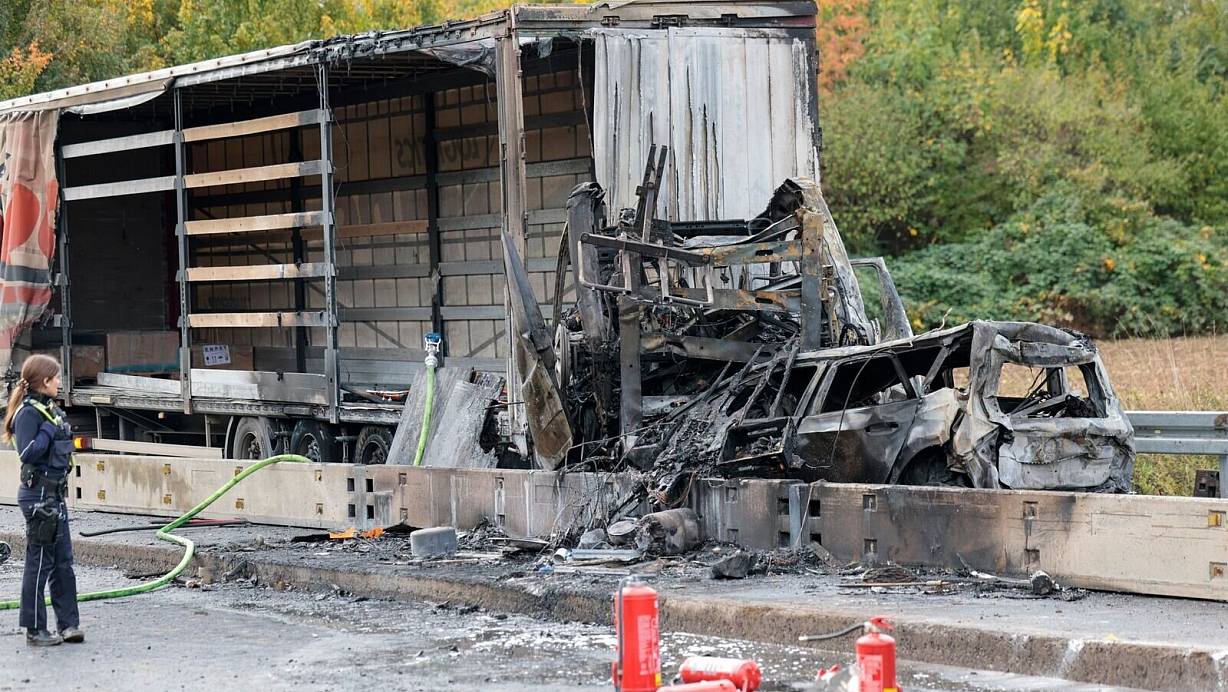 Nach ersten Erkenntnissen der Polizei war ein Wohnmobil aus noch ungeklärter Ursache am Vormittag im Bereich einer Baustelle auf einen vorausfahrenden Lastwagen aufgefahren. Ein nachfolgendes Auto sei unter das Wohnmobil geraten – beide Fahrzeuge fingen Feuer.