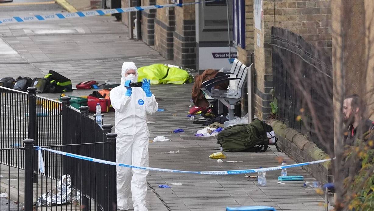 Rucksäcke und Kleidung liegen an diesem Morgen verstreut auf dem Boden vor dem Bahnhof in der englischen Stadt Huntingdon. Forensiker untersuchen jedes noch so kleine Detail, umrandet von dem typisch blau-weißen Absperrband. Ein Zug, der am Sonntag auf den Gleisen des Bahnhofs stand, wurde nahe der kleinen Stadt in der Grafschaft Cambridgeshire erst am Abend zuvor Schauplatz einer verheerenden Attacke.