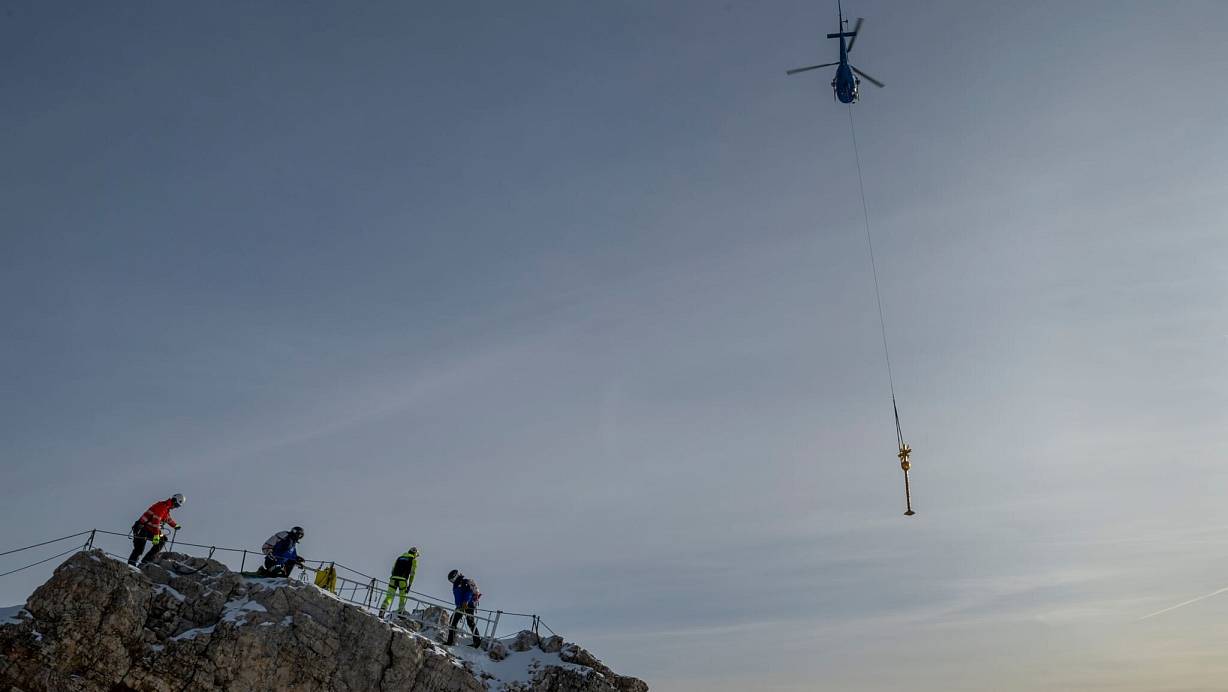 Das berühmte goldene Gipfelkreuz an der Zugspitze strahlt nicht mehr in vollem Glanz. Es ist mit Hunderten Stickern beklebt, mit denen sich Besucher auf Deutschlands höchstem Berg verewigt haben. Nun muss es restauriert werden.