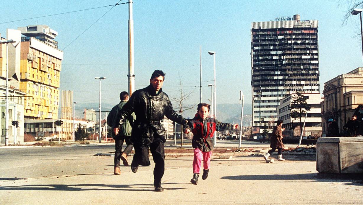 Szene aus dem Jahr 1994: Ein Einwohner Sarajvos rennt mit seinem kleinen Sohn an der Hand über die Straße, um sich in Sicherheit vor Heckenschützen zu bringen. | © picture alliance / epa Ch.Simon/epa/dpa