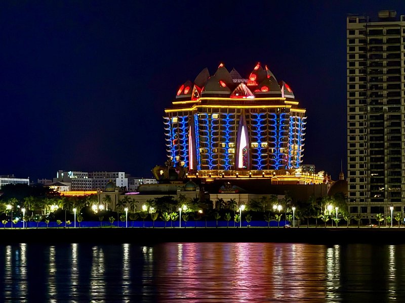 Wenn die Dunkelheit über den Mekong fällt, wird der Prachtbau des luxuriösen Kapok Star Hotel mit seinem riesigen Kasino in ein Meer aus Licht getaucht – Farben wandern über die Fassaden, tanzen über Wände und Dächer, als würde das Gebäude selbst pulsieren.
