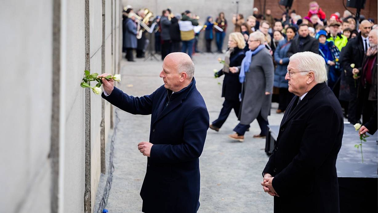 Während der Feierstunde steckten die Teilnehmenden, darunter Angehörige von Mauer-Opfern, Bürgerrechtler und Jugendliche aus Polen, Frankreich und Norwegen, Rosen in einen Spalt der noch erhaltenen Mauer an der Bernauer Straße - auch um an die Opfer zu erinnern.
