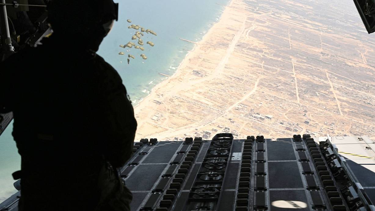 Die Luke des Transport-Airbus 400M öffnet sich drei Minuten vor dem Abwurf, der Blick fällt erst auf das Meer, wenig später auf den Gazastreifen 600 Meter darunter. Gleißende Sonne fällt auf Trümmer, so weit das Auge reicht. Von hier oben nicht zu erkennen: Die Menschen dort unten, die von einer Hungersnot bedroht sind. Ihnen gilt die Ladung, die nun aus dem Flugzeug an Fallschirmen zu Boden gleitet.
