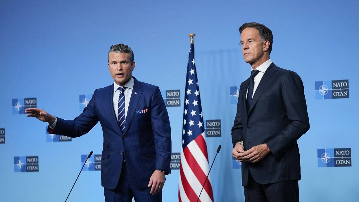 Will, dass die Europäer US-Waffenlieferungen für die Ukraine bezahlen: US-Verteidigungsminister Pete Hegseth (l), hier mit Nato-Generalsekretär Mark Rutte. | © Virginia Mayo/AP/dpa